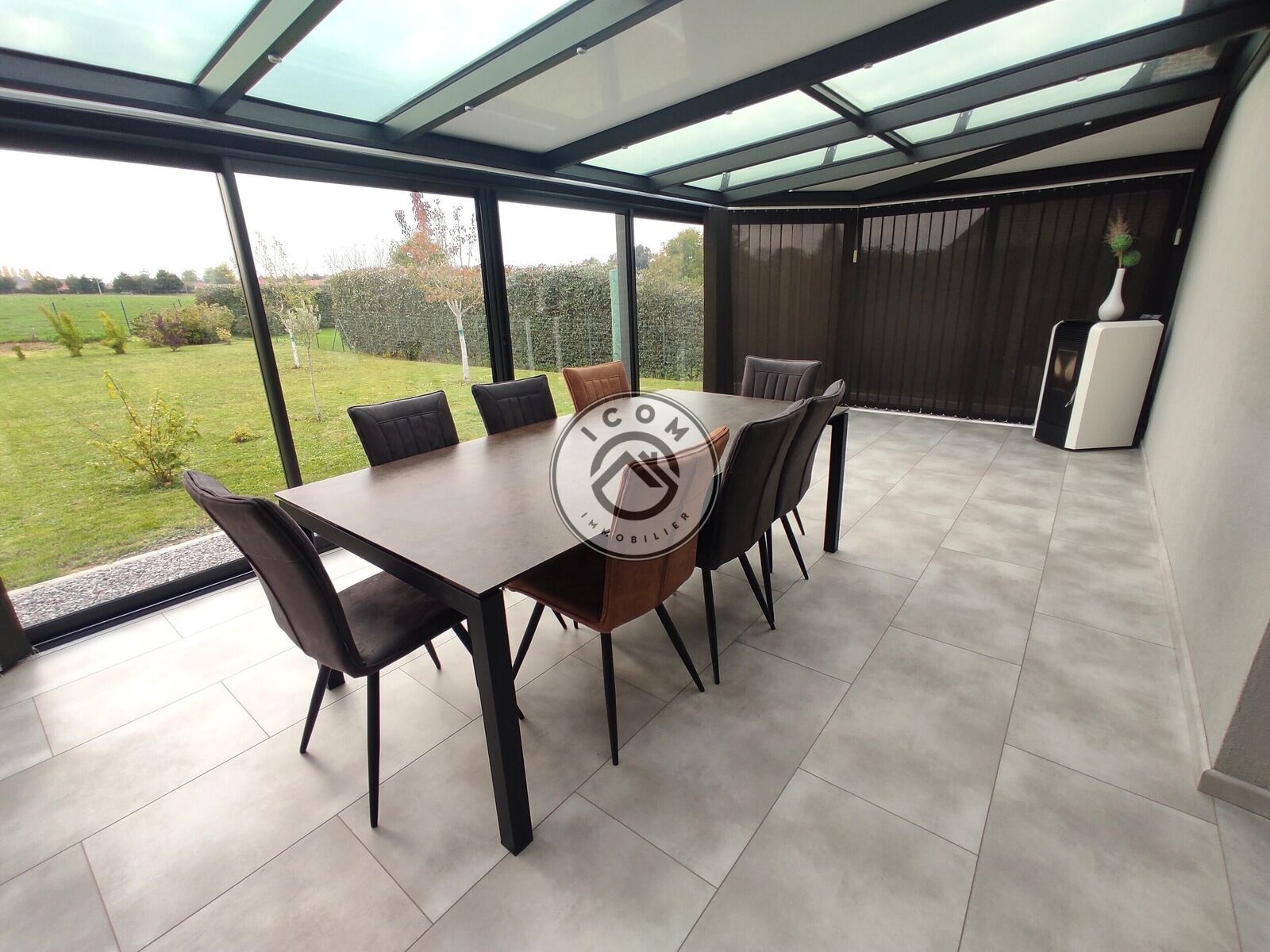 Il comprend au rez de chaussée : une entrée - une cuisine équipée ouverte sur un salon spacieux - une véranda de 25 m² avec un feu à pellets - trois chambres - une salle d'eau - un wc suspendu - un grand cellier
