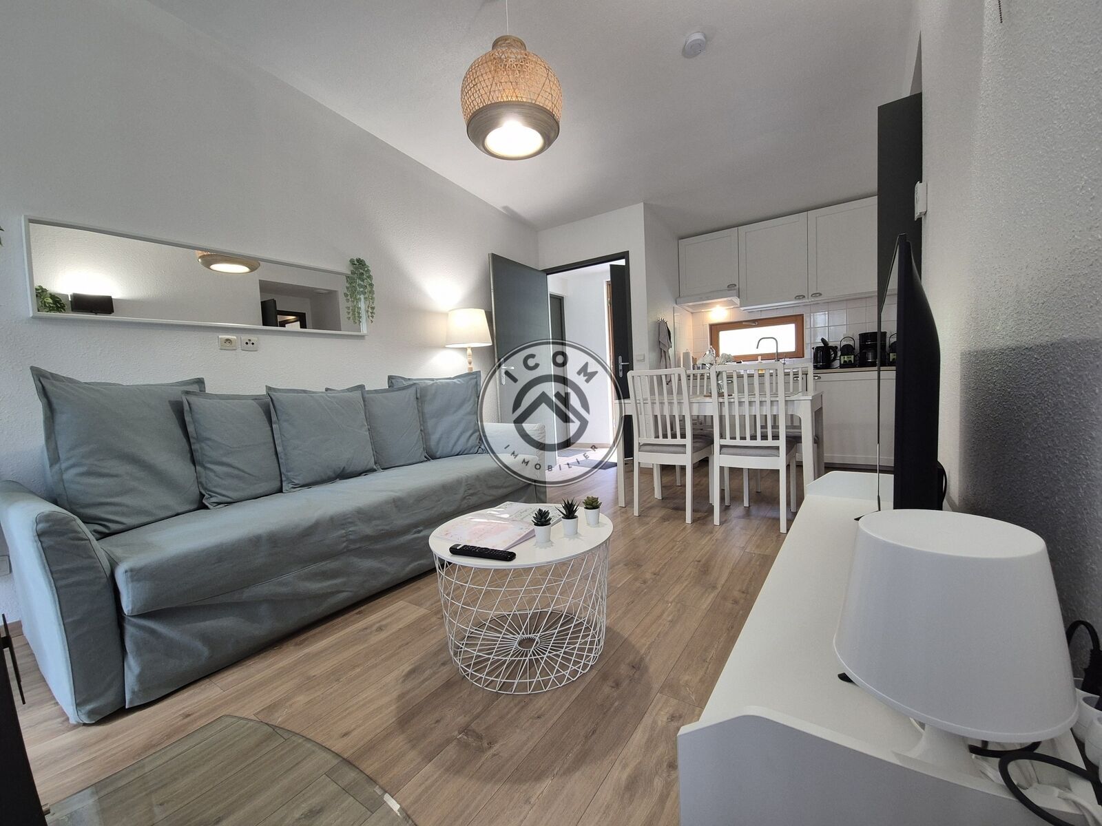 Séjour avec cuisine ouverte entiÚrement équipée, plaques induction, lave-vaisselle, lave linge, réfrigérateur intégrés