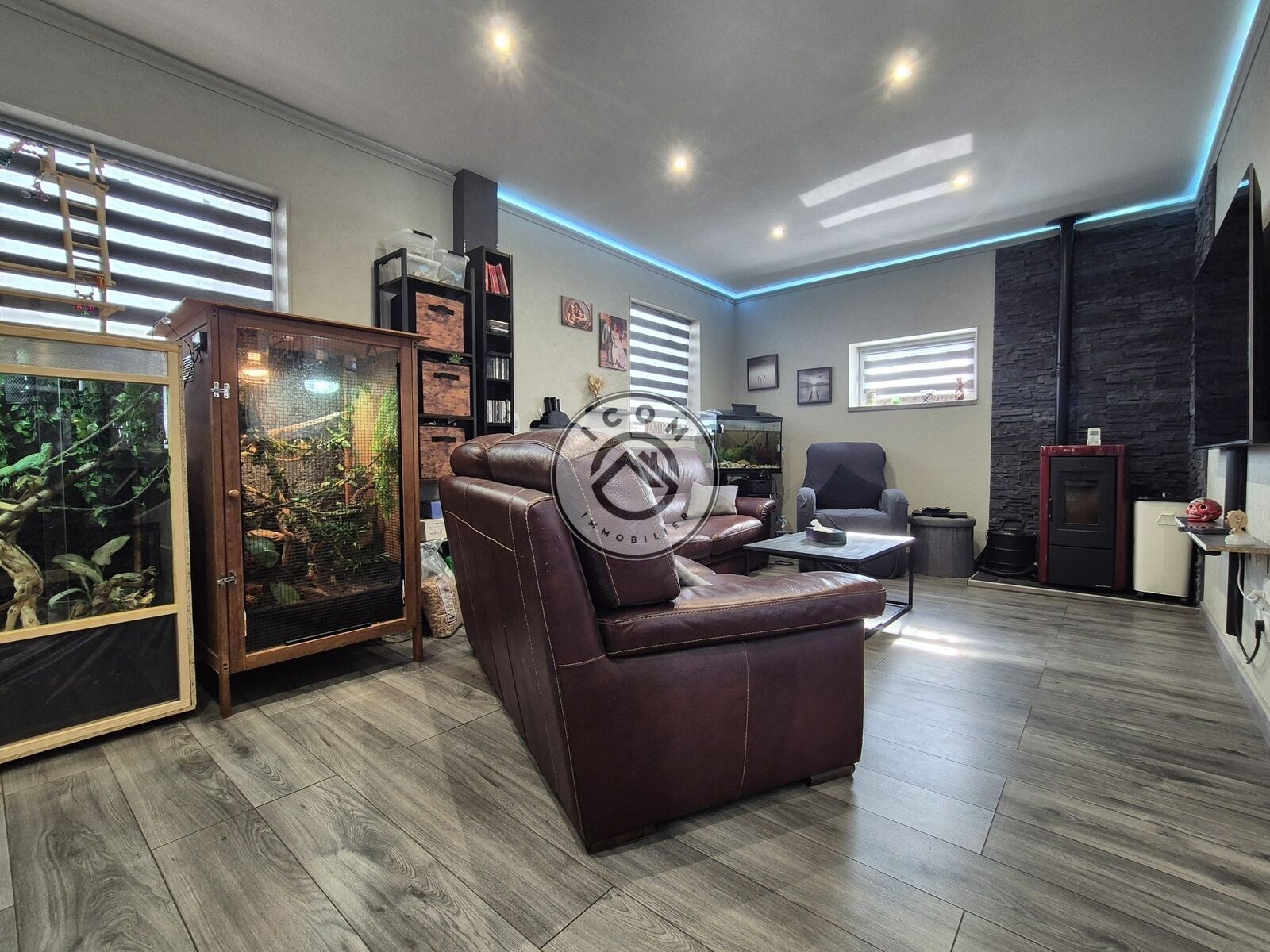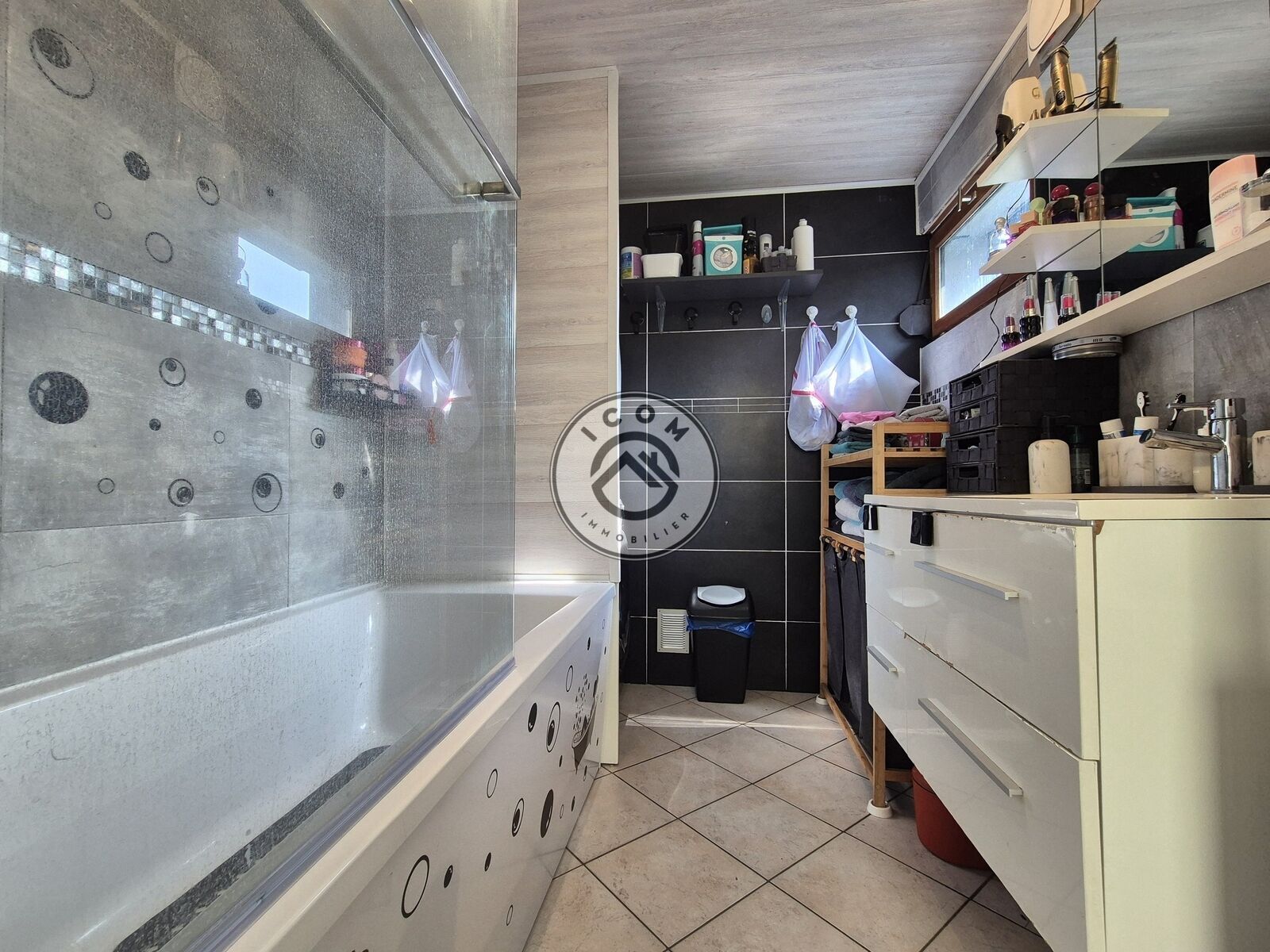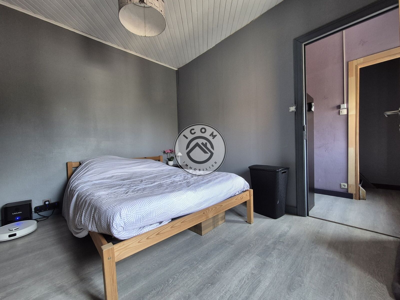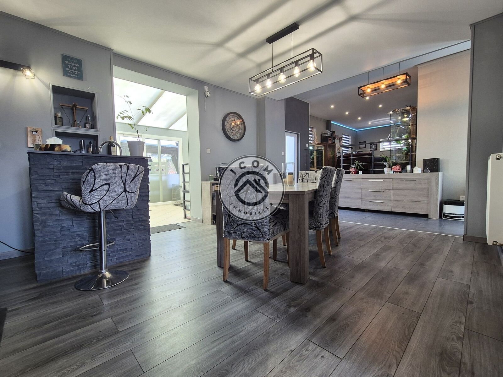 Au rez-de-chaussée : grande pièce de vie ouverte avec cuisine aménagée et équipée, salle de bains moderne et WC.
